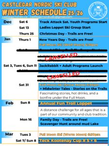 ⮞ Unfortunately we are having to cancel tonight’s Moonlight Ski due to icy conditions on the trails. Monday night’s rain storm has turned the top layer of snow to ice and it will likely take a couple of days for us to break open and tenderize the trails enough to consider them safe for night skiing.